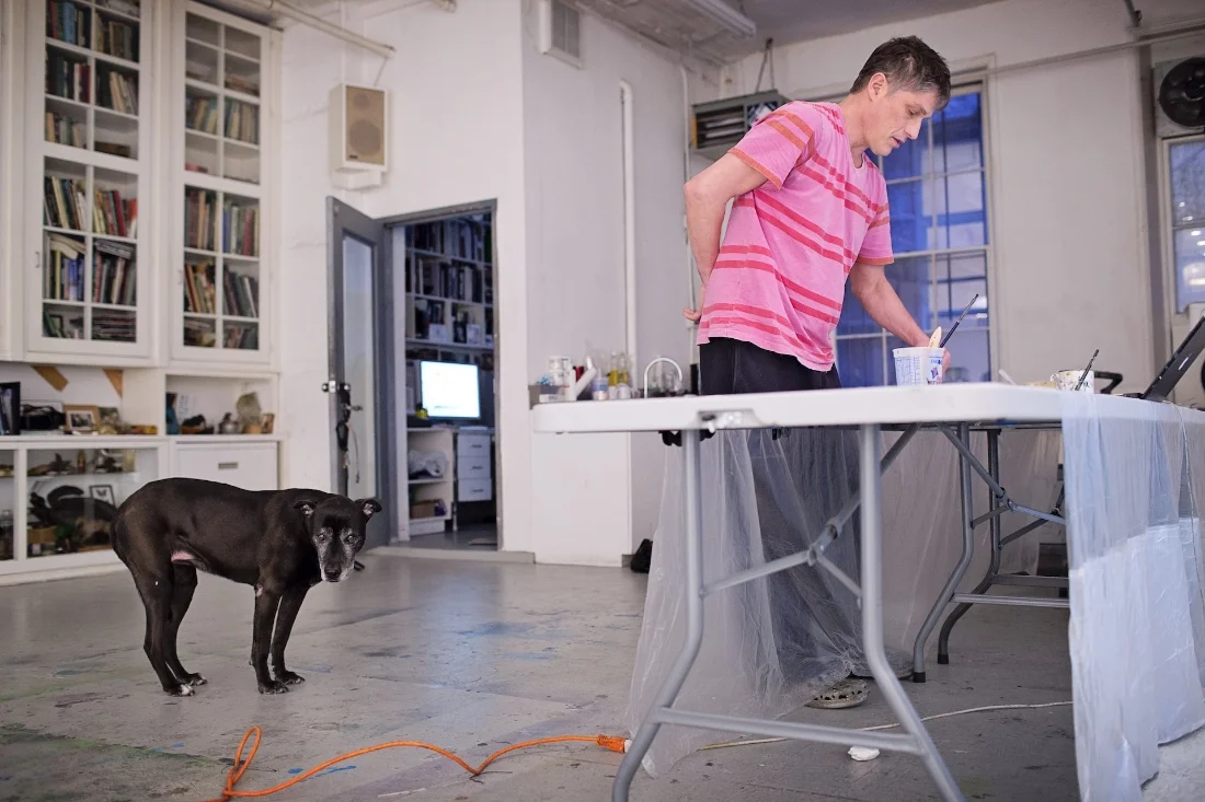 Alexis Rockman and a dog named Padme photographed by Kimberly M. Wang